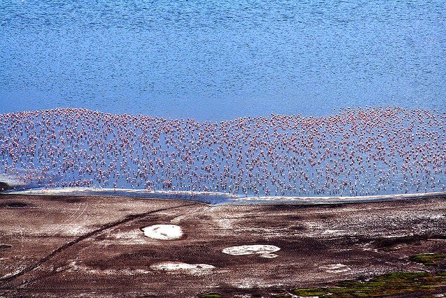 Lake Nakuru is a very shallow lake in central Kenya. The lake’s abundance of algae attracts vast quantities of lesser flamingos, sometimes more than one million at once. Often called the greatest bird spectacle on earth, the flamingos are one of Kenya’s top attractions.
